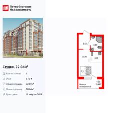 Продается уютная студия от застройщика в жилом комплексе ''Консул'' в Ленинградском районе.Удобная, классическая, функциональная европланировка, большая кухня-гостиная 2.96 м², просторная прихожая 3.53 м². Общая площадь студии - 22.04 м², жилая 10.64 м², высота потолка 2.7 м.Квартира продается с отделкой ''Серый ключ с возможностью дозаказа NORD LINE ++''.Что особенного в ЖК ''Консул''?• Развитая инфраструктура• Двор без машин• Закрытая, огороженная территория• Квартиры с отделкой - заезжай и живи• Детские площадки для детей разных возрастов• Подземный паркинг и кладовые помещения