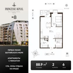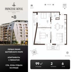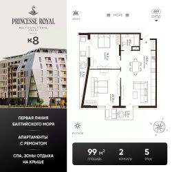 Акция КВАРТИРНИК К8.Цена действует при 100% оплате (в т.ч. ипотекой без субсидирования) или рассрочке до 6 месяцев и первоначальном взносе от 50%. Срок действия акции с 18.11.26-07.02.26.Акция не суммируется ни с какими другими акциями на сайте.ПРИНЦЕСС РОЯЛ (PRINCESSE ROYAL)Эксклюзивные апартаменты на первой линии в ЗеленоградскеЭлитный мультифункциональный отель ''PRINCESSE ROYAL'' расположился в курортном Зеленоградске, прямо на променаде Балтийского моря. В продаже апартаменты на 5-7 этажах. Апартаменты будут реализованы только с дизайнерским ремонтом и в полной комплектации. После ввода объекта, недвижимость можно будет отдать под управление профессиональной управляющей компании и извлекать пассивный доход.Из каждого апартамента открывается завораживающий вид на Балтийское море. Панорамное остекление позволяет наслаждаться морскими пейзажами и закатами, не выходя из дома, а продуманная планировка делает пространство максимально функциональным.Срок сдачи - 3 квартал 2027 года.На территории комплекса расположатся: отель, оздоровительный SPA-комплекс с открытыми и закрытыми бассейнами, комплекс бань, семейный ресторан на первом этаже, ресторан высокой кухни на эксплуатируемой кровле, магазины,конференц-зал, спортзал, источники с лечебно-столовой минеральной водой, поступающей из скважин Королевы Луизы. В зоне ресепшн для вашего комфортного пребывания будет работать сервис 24/7, предоставляющий полный спектр услуг. Подземный паркинг будет сдаваться в аренду.''PRINCESSE ROYAL'' окружает безупречная инфраструктура! Сделайте шаг из дома — и вы на променаде, сразу же спуск к морю. Всего 3 минуты неспешной прогулки — и вы в сердце Зеленоградска. На автомобиле: 5 мин до Куршской косы, 20 мин до аэропорта Храброво, 30 мин до центра Светлогорска, 35 мин до центра Калининграда.Покупка происходит посредством заключения договора долевого участия. Действует классическая программа ипотеки, рассрочка от застройщика или 100% оплата за собственные средства. Помощь с оформлением сделки от ипотечного брокера и юристов застройщика.Больше подробностей вы можете узнать по телефону отдела продаж. Звоните!Не является публичной офертой, предложение ограничено, оценивайте свои финансовые возможности и риски. Застройщик: ООО СЗ Компас. Проектная декларация размещена на сайте наш.дом.рф. Сроки, условия проведения акций и актуальные цены на сайте девелопера. Когда вы выбираете недвижимость от К8 — вы выбираете комфортную, продуманную и растущую в цене среду для жизни или инвестиций.Что вы получаете:1. Недвижимость, которая дорожает: каждый проект создаётся так, чтобы его ценность росла. Вы покупаете актив, который работает на вас.2. Продуманные концепции: вы живете в пространстве с идеей, смыслом и логикой - где каждая деталь служит вашему удобству.3. Настоящий комфорт: планировки, которые экономят место и время. Дома, где технические решения подчинены вашему образу жизни.4. Эстетику, которая радует каждый день: архитектура, на которую приятно