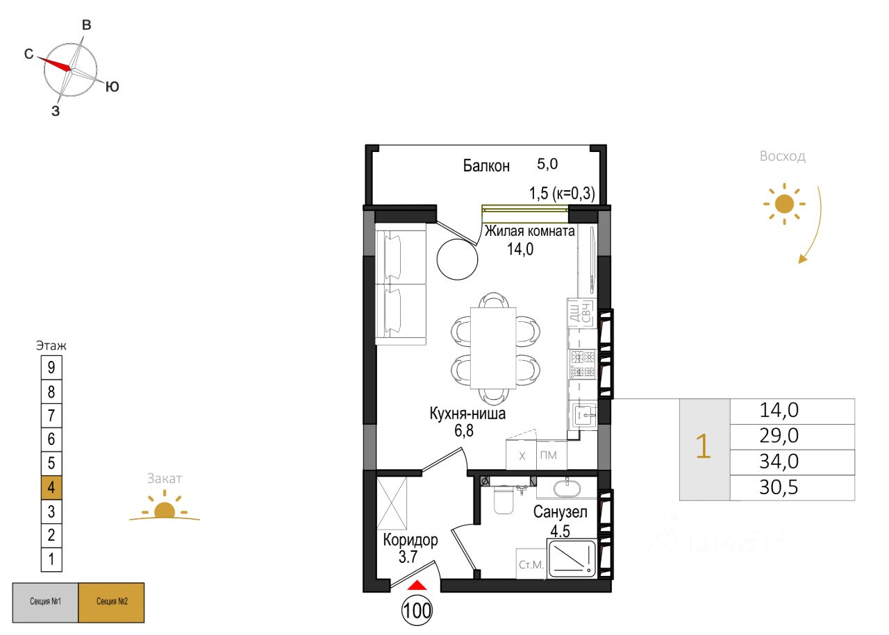 34 м² · Этаж 9 из 9