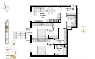 Продается квартира площадью 82.3 м² на 1 этаже 8 секции в Дом на Красной от компании ГК ''ТРЕСТ''. Площадь кухни 16.9 м². Жилой комплекс комфорт-класса ''Дом на Красной'' расположен в Центральном районе Калининграда на пересечении улиц Красная и Псковская. Жилой комплекс включает в себя два дома высотой 8 этажей. Срок сдачи намечен на 4 квартал 2026 года. Жилой комплекс ''Дом на Красной'' имеет среднюю комфортную этажность. Благодаря геометрическим формам, заложенным в архитектурный облик зданий, их конфигурация образует почти закрытую дворовую территорию. Фасад домов выполнен из комбинированных материалов (декоративная штукатурка и плитка под кирпич) в динамичном стиле с выступающими и утопленными частями и панорамными окнами. Архитектуру жилого комплекса подчеркивает декоративная подсветка фасада. В каждом подъезде созданы помещения для хранения колясок, велосипедов и спортинвентаря, которыми могут пользоваться все жильцы.Планировочные решения предусматривают квартиры с просторными кухнями-гостиными, мастер-спальнями и гардеробными. В квартирах, которые передаются покупателям без отделки (''Серый ключ''), предусмотрены открытые террасы с видом на Школьное озеро или красивый внутренний двор, панорамные окна, лоджии с холодным остеклением, потолки высотой 2,72 м. Для удобства автомобилистов созданы подземные паркинги: на 136 машиномест и кладовые помещения. В паркинг можно будет спуститься на лифте комфортно людям, безопасно автомобилям!