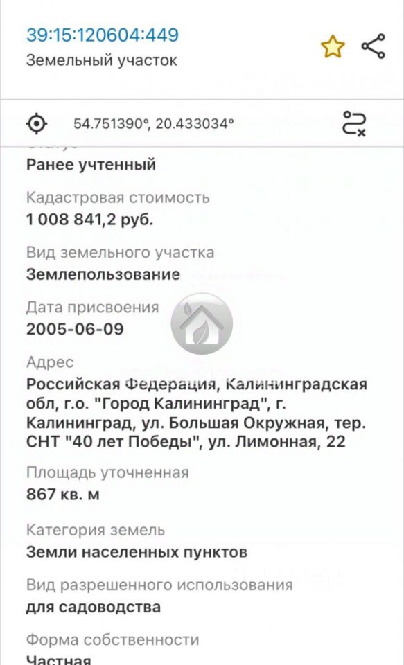 Арт. 96144546 Продается земельный участок 5,6 соток в СНТ ''Победа'' (Ленинградский район, Калининград).Площадь: 5,6 соток, ровный, правильной формы.Коммуникации:Электричество: столбы по границе участкаГаз: СНТ газифицировано, трубы идут по границе участка.На участке посажены плодовые деревья и кустарники: яблони, грецкий орех, калина, малина.Окружение: Активная застройка, много жилых домов, соседи проживают постоянно.Дороги: - Центральные улицы СНТ асфальтированы. - Подъезд к участку — грунтовая дорога (200 м). Расположение и инфраструктура:Район: СНТ ''Победа'' (ориентир — Северная гора), между ул. Горького и Северной горой. Транспорт: - Рейсовый автобус рядом. - Продуктовые магазины в шаговой доступности. - 10 мин пешком до благоустроенного Ашман-парка. - Удобный выезд в центр города и область по новой транспортной развязке.Дополнительные преимущества:Городская прописка (возможность регистрации). Хорошая транспортная доступность — близко к центру и новым развязкам. Развитая инфраструктура — магазины, парк, общественный транспорт.Приезжайте на просмотр — участок готов к использованию под дачу или для строительства.
