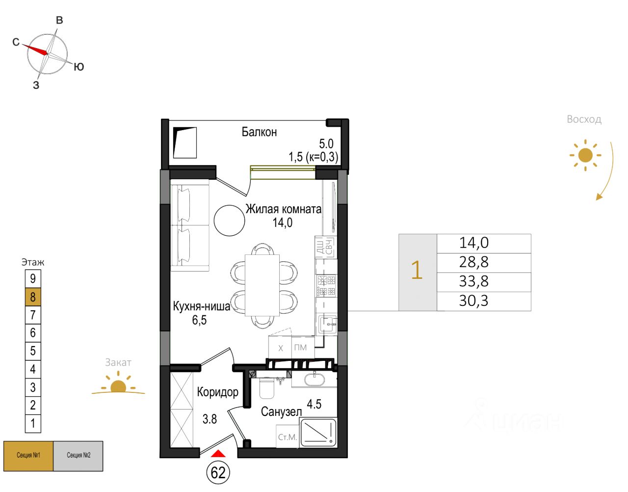 Общая площадь30,3 м2