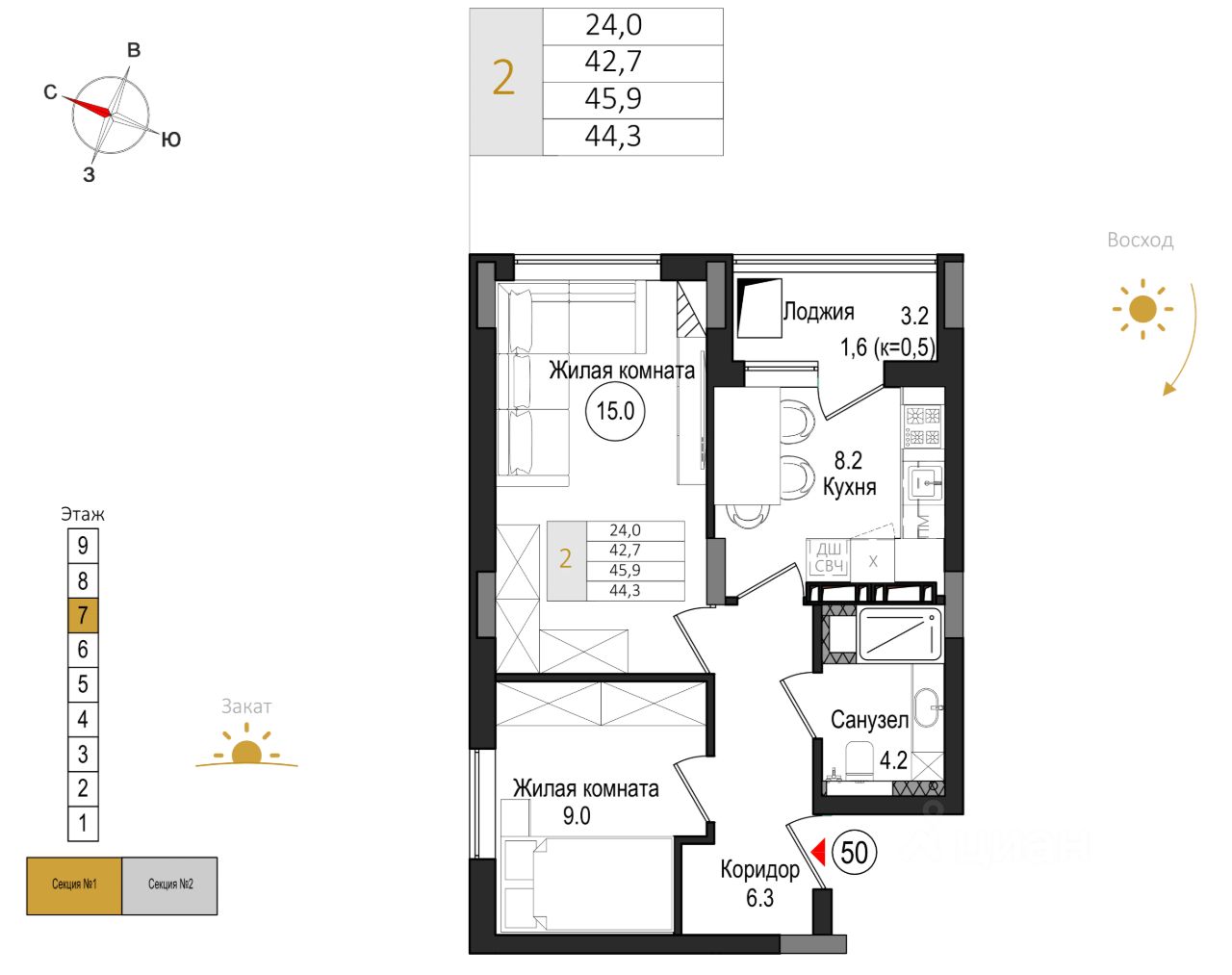 Общая площадь44,3 м2