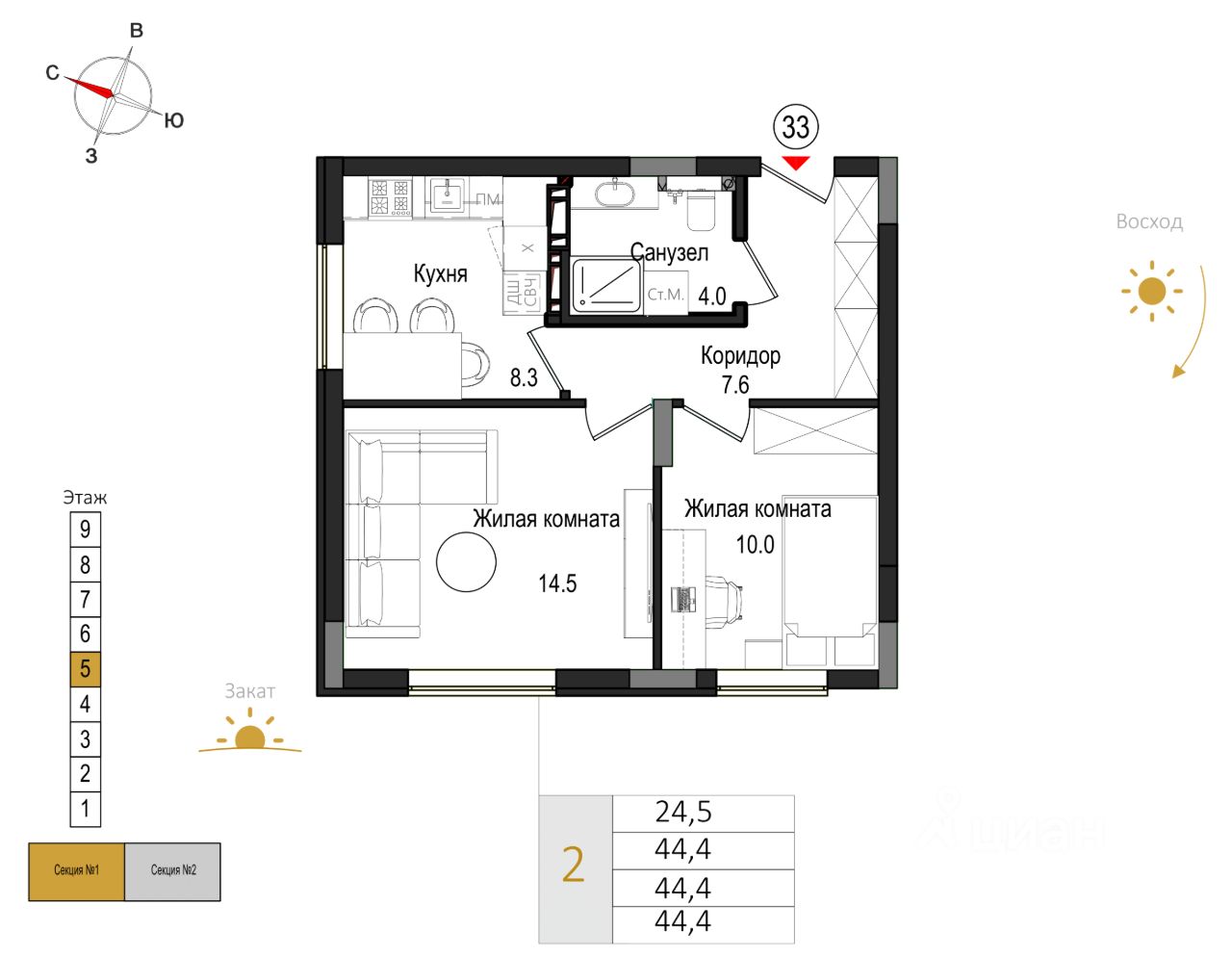 Общая площадь44,4 м2