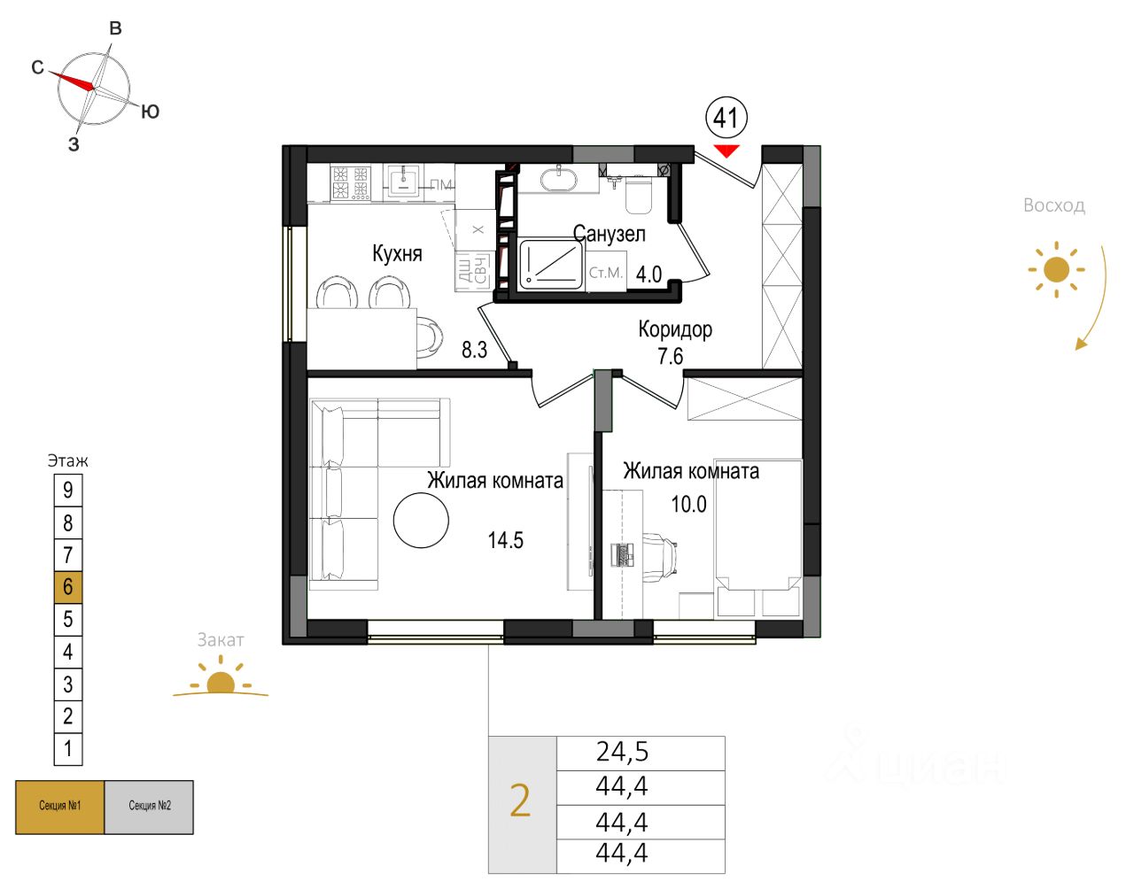 Общая площадь44,4 м2