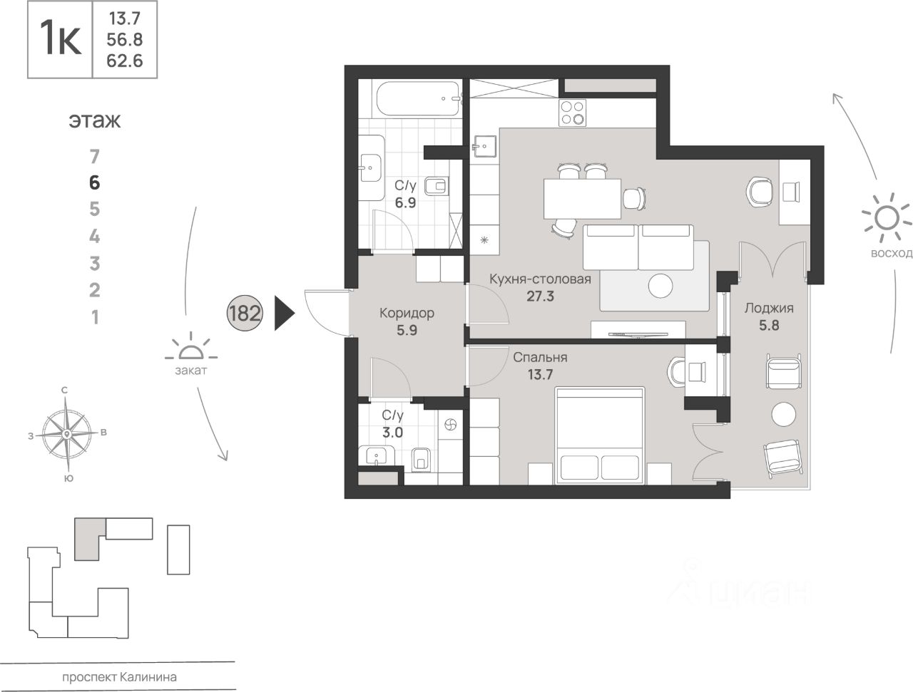 продам 1-к, Калинина проспект, 11115 340 881 ₽