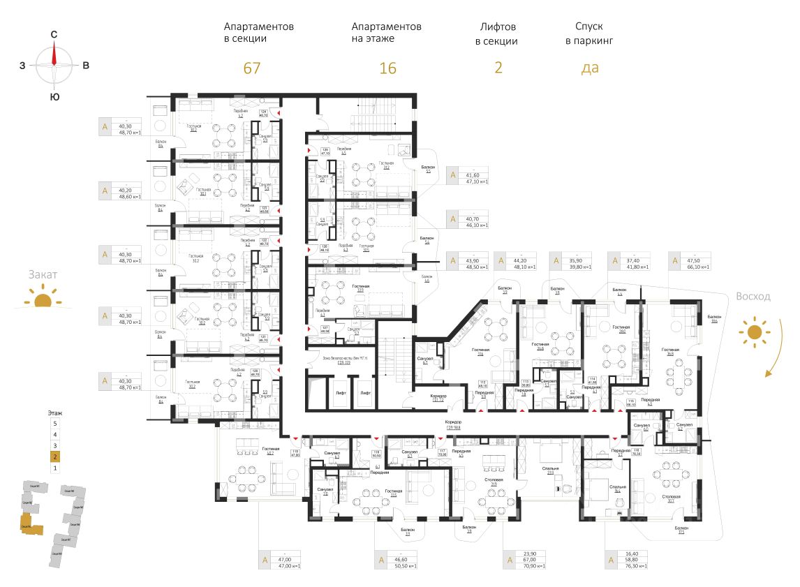 Комплекс состоит из восьми корпусов с различными вариантами планировочных решений от студий площадью 28,5 м2 до апартаментов площадью 82,1 м2 с открытыми террасами. Высота потолков - 3 м. Предусмотрен подземный паркинг на 286 мест.