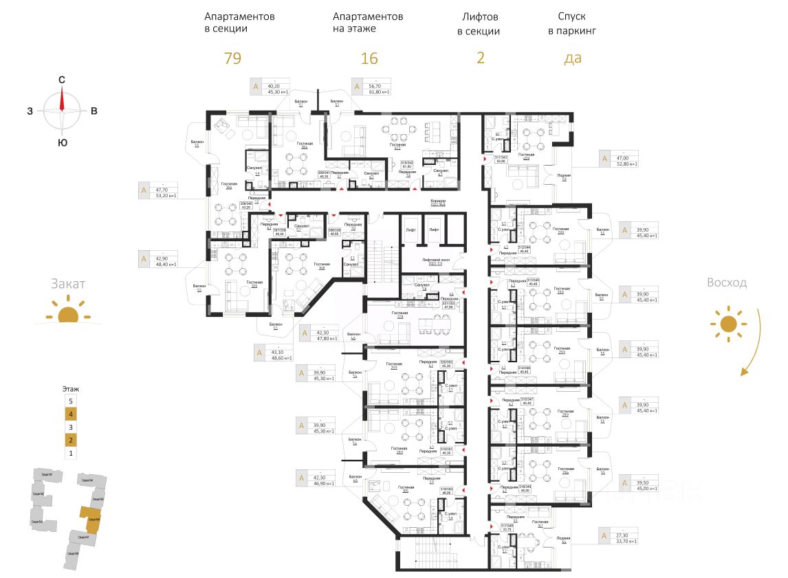 Комплекс состоит из восьми корпусов с различными вариантами планировочных решений от студий площадью 28,5 м2 до апартаментов площадью 82,1 м2 с открытыми террасами. Высота потолков - 3 м. Предусмотрен подземный паркинг на 286 мест.