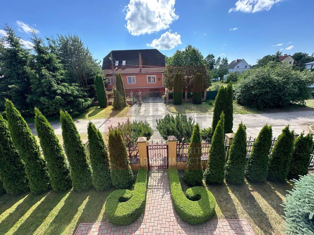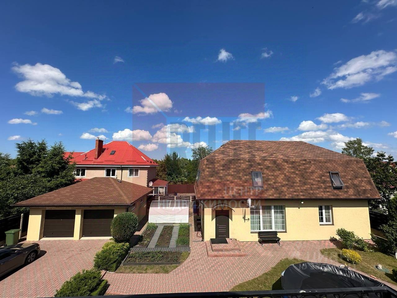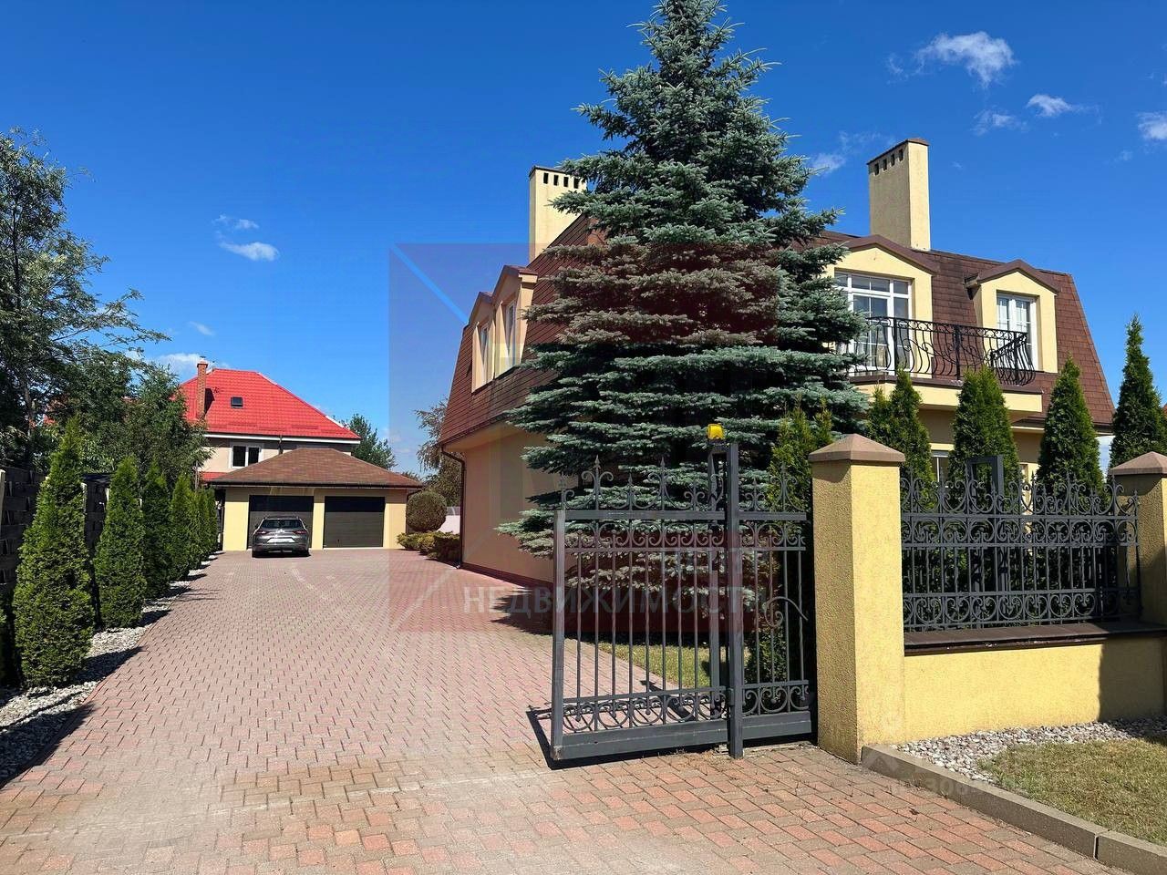 Комплекс расположен на земельном участке 12 соток. Территория полностью огорожена, на участке выполнен ландшафтный дизайн, высажены вечнозеленые деревья и кустарники, обустроена зона барбекю с беседкой. Гараж на 2 автомобиля имеет удобный подъезд.