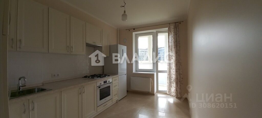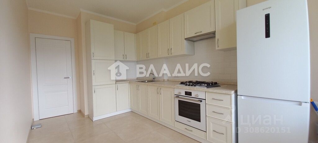 Остается встроенный кухонный гарнитур с крашенными фасадами укомплектован техникой (газовая поверхность, духовой шкаф, холодильник).