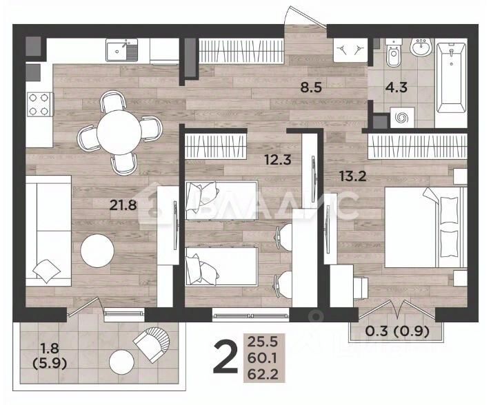 Продуманная, современная и очень удобная планировка. Общая площадь квартиры 62,2 кв. м. Кухня-гостиная 21,8 кв. м, с выходом на просторную лоджию с панорамным остеклением площадью 5,9 кв. м. Комнаты изолированные 13,2 кв. м с выходом на фрацузкий балкон + 12,3 кв. м. Санузел 4,3 кв. м. Прихожая - 8,5 кв. м. Комнаты и кухня правильной квадратной формы. Шикарная большая лоджия.