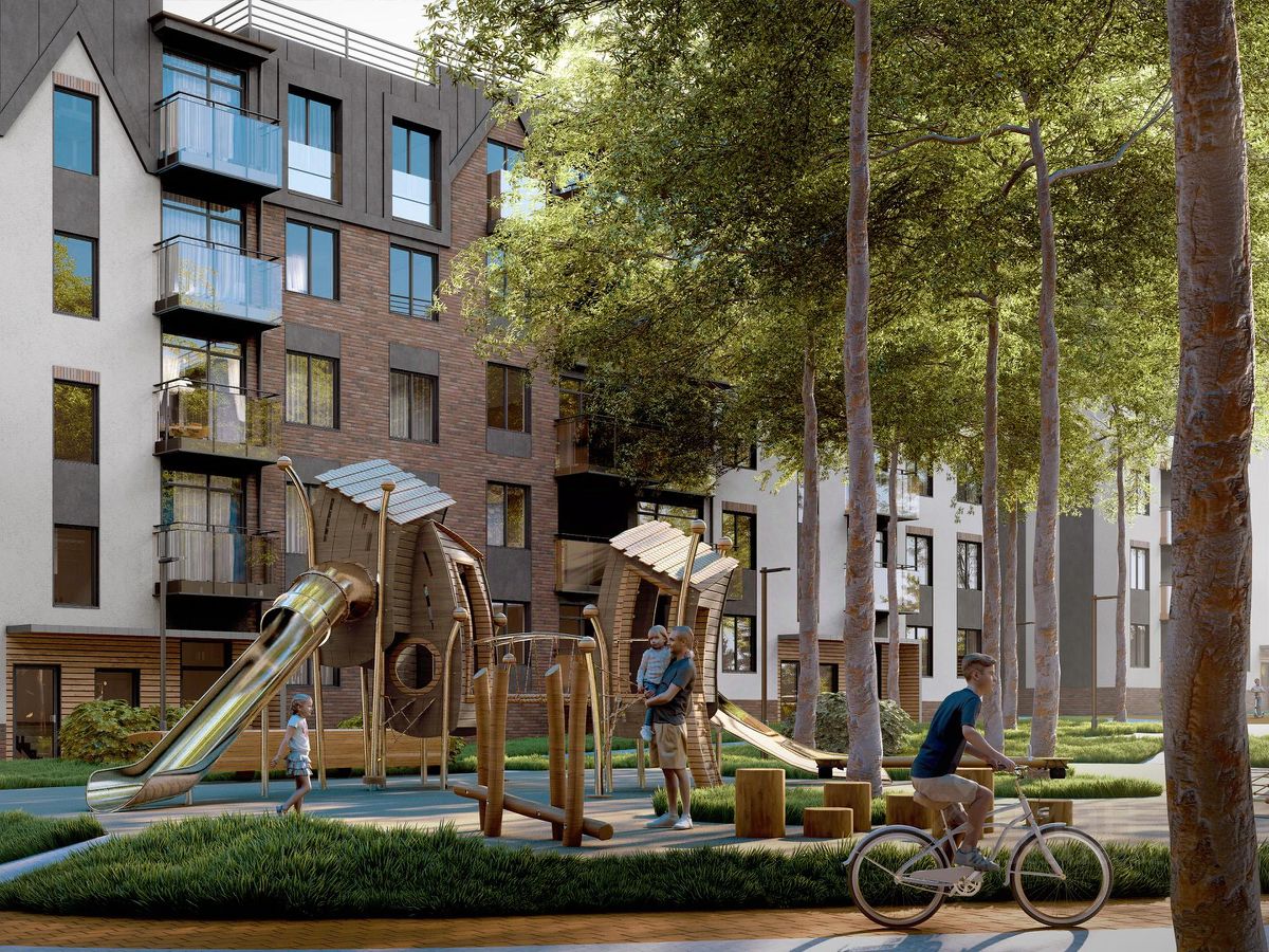 Природное окружение • Рядом с комплексом расположены сосновый бор и парк ''Кольцо Здоровья'', что создаёт условия для активного отдыха и прогулок в экологически чистой зоне. • Во дворе ЖК сохранены взрослые деревья, а территория благоустроена как парк с детскими площадками, беговой дорожкой и зонами отдыха.