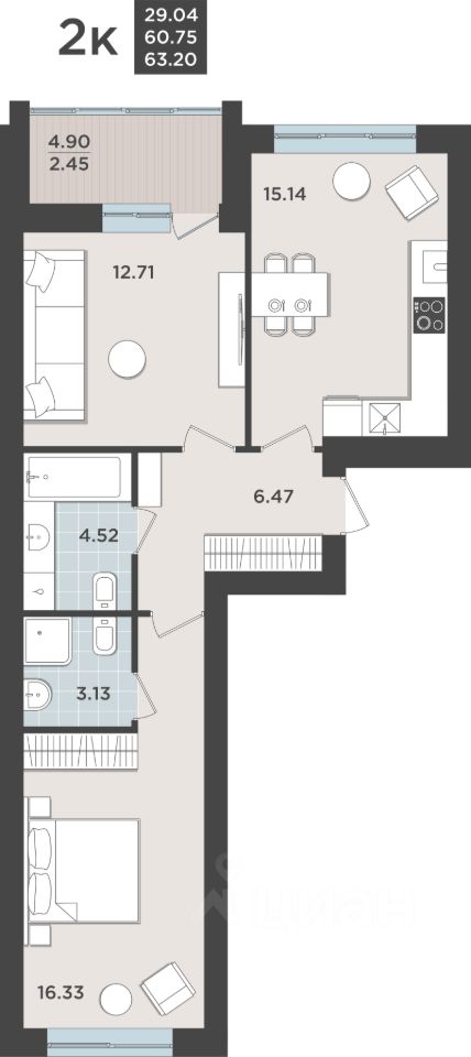Общая площадь60,75 м2