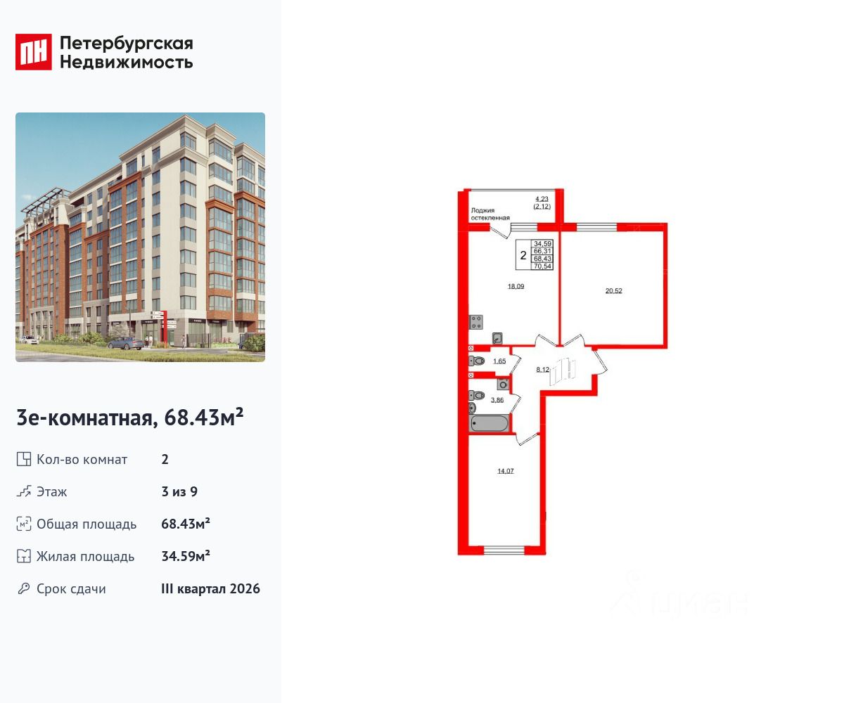 Удобная, классическая, функциональная европланировка, большая кухня-гостиная 18.09 м², просторная прихожая 8.12 м². Общая площадь квартиры - 68.43 м², жилая 34.59 м², высота потолка 2.7 м.