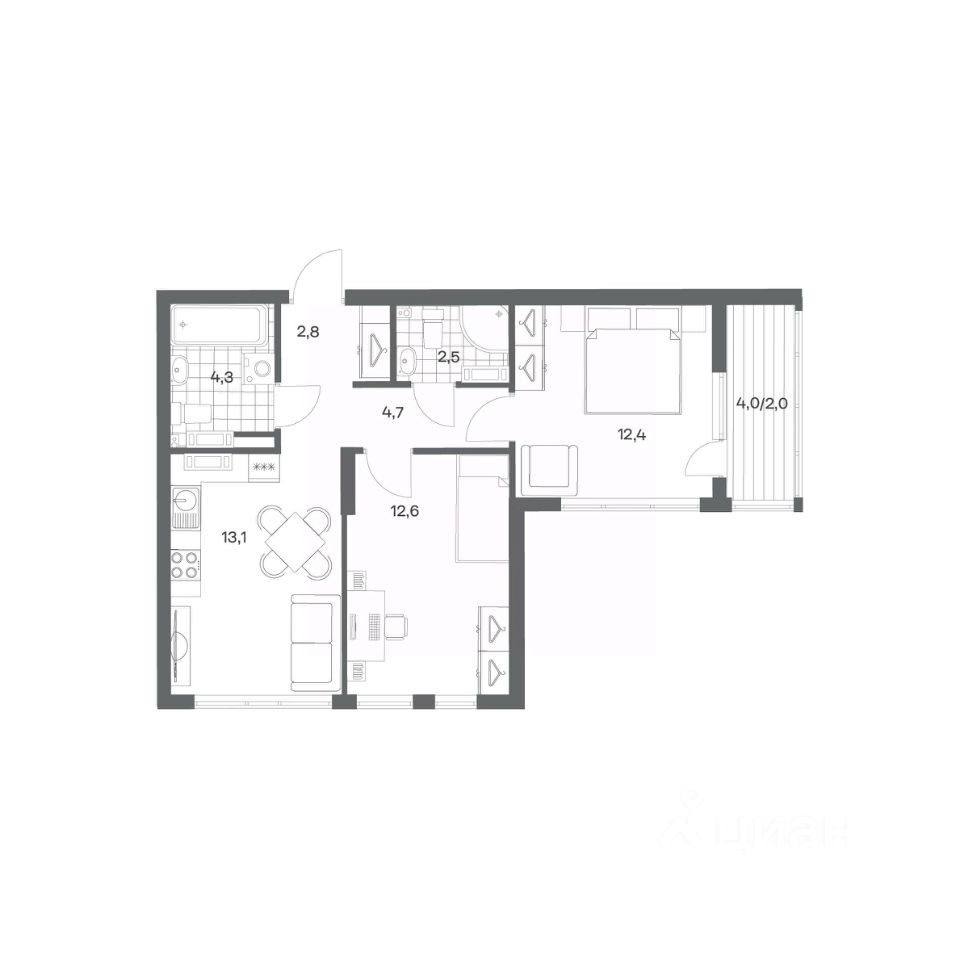 Продается квартира площадью 54.4 м² на 5 этаже 1 секции в Гагарина 30 от компании ГК ''ТРЕСТ''. Площадь кухни 13.1 м². Жилой комплекс комфорт-класса ''Гагарина 30'' расположен в Ленинградском районе Калининграда на улице Юрия Гагарина. Жилой комплекс включает в себя три корпуса высотой 9-18 этажей. Срок сдачи намечен на 1 квартал 2028 года.
