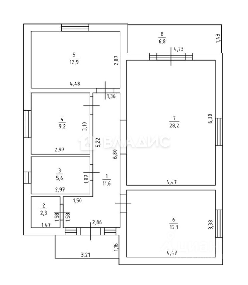 Удобная продуманная планировка: - общая площадь - 98,3 кв.м., прихожая - 11,6 кв.м., кухня-гостиная - 28,2 кв.м. с застеклённым в пол выходом на террасу - 6,8 кв.м., спальни - 15,1+12,9+9,2 кв.м., санузел совмещённый - 5,6 кв.м., бойлерная - 2,6, крыльцо - 3,7 кв.м.