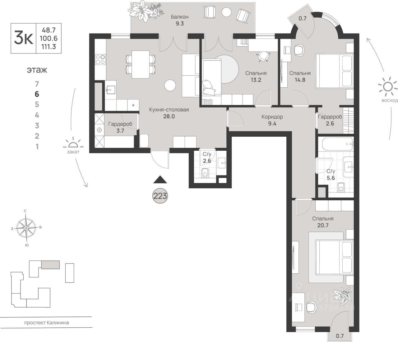 продам 3-к, Калинина проспект, 11127 334 484 ₽