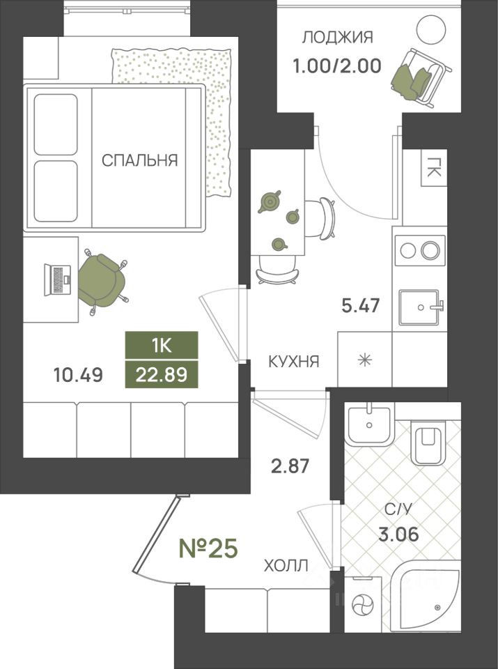 Общая площадь22,89 м2