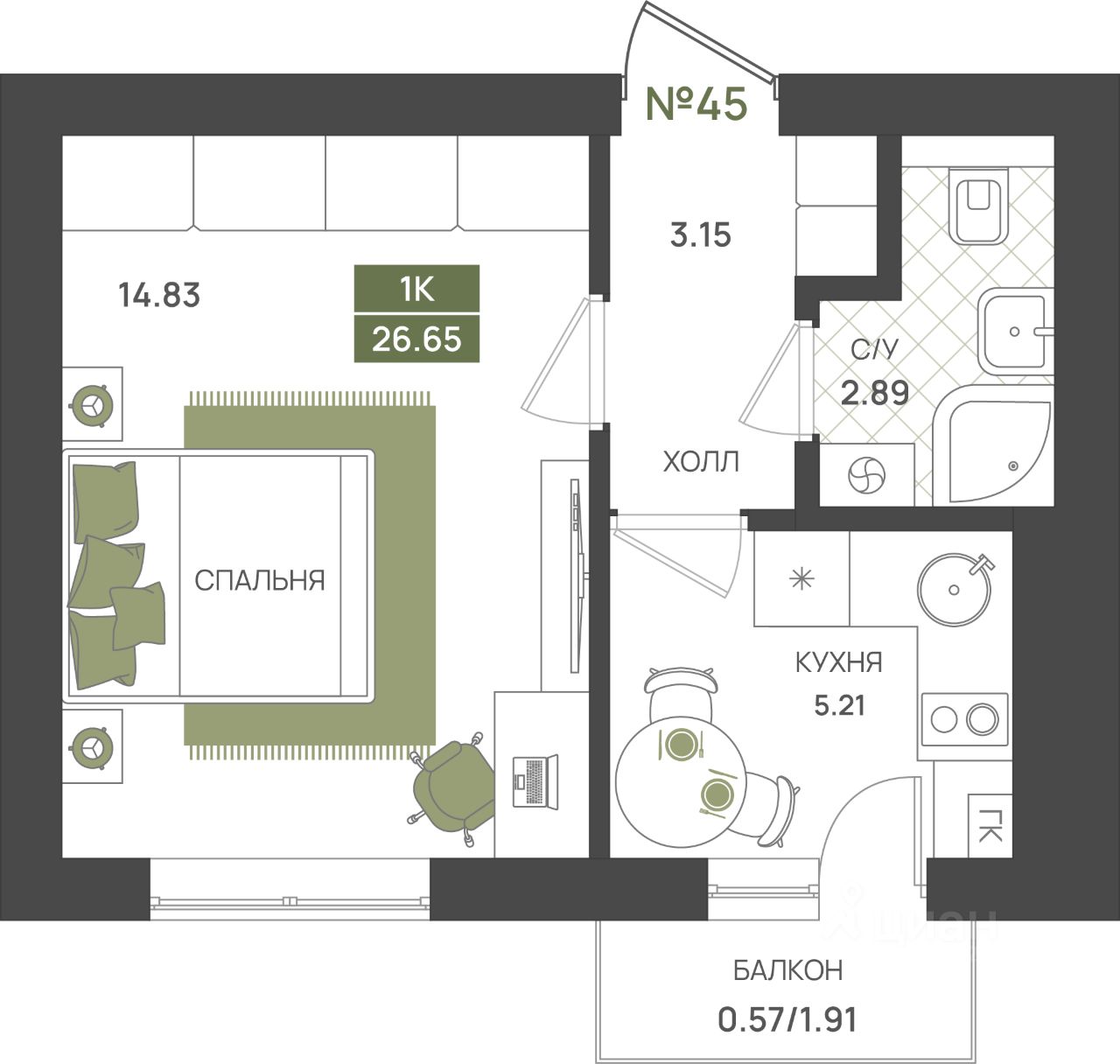 Общая площадь26,65 м2