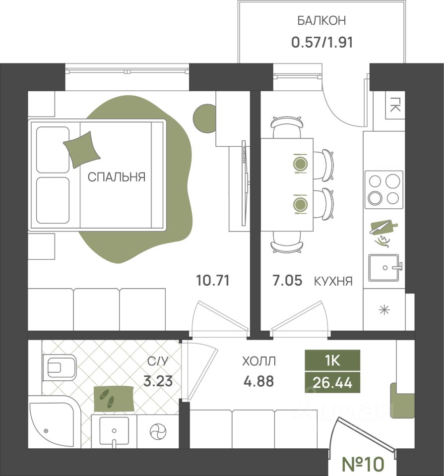 Общая площадь26,44 м2