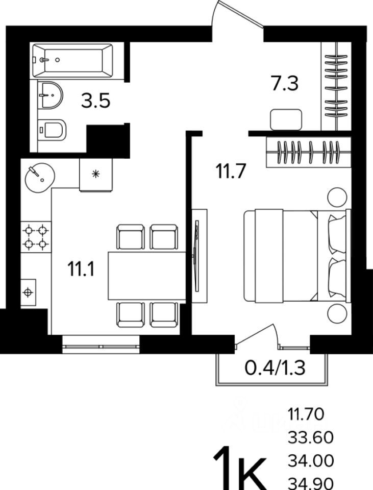 Общая площадь34 м2