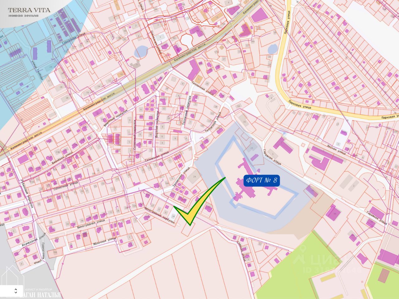 - в красивом и спокойном месте у Форта 9 с соседями только с одной стороны - по улице Суворова и далее Калининградскому шоссе у большого якоря Калининград