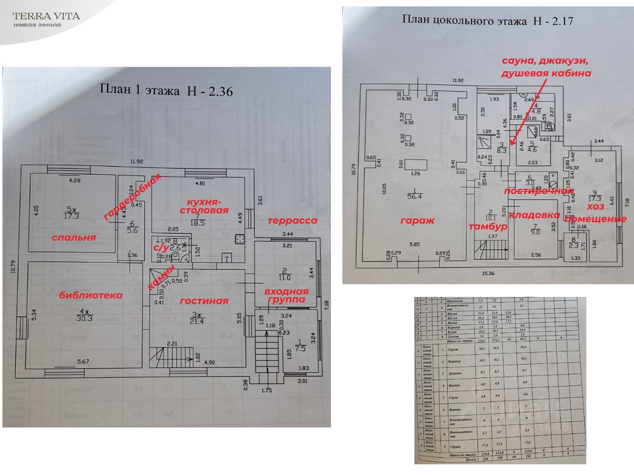 • цокольный этаж: высокий с полноразмерными окнами на уровне земли - гараж с электрическими воротами и вторым выходом 56.4 м2 - тамбур со входом из гаража и лестницей из жилого сектора 10.1 м2 - кладовая 9 м2 - постирочная 3 м2 - блок сауны: сауна электрическая, душевая кабина, ванна/джакузи, туалет, место отдыха 17.7 м2