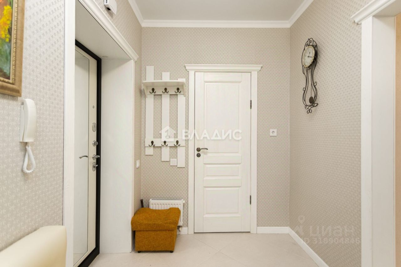 Общая площадь квартиры составляет 89,7 квадратных метров, из которых 28 квадратных метров занимает кухня. Высота потолков — 2,7 метра. В квартире выполнен дизайнерский ремонт. Окна выходят на улицу. Планировка изолированная, есть один раздельный санузел и один совмещённый. Также имеются лоджия и балкон. Отопление индивидуальное, от котла.