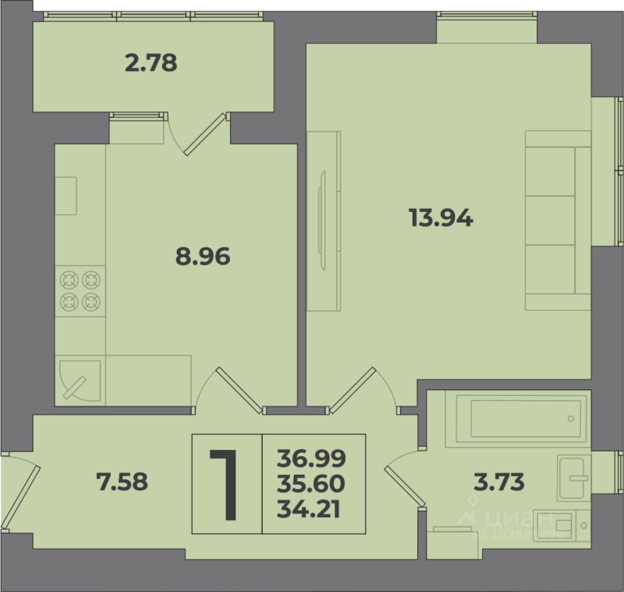 Общая площадь36,99 м2