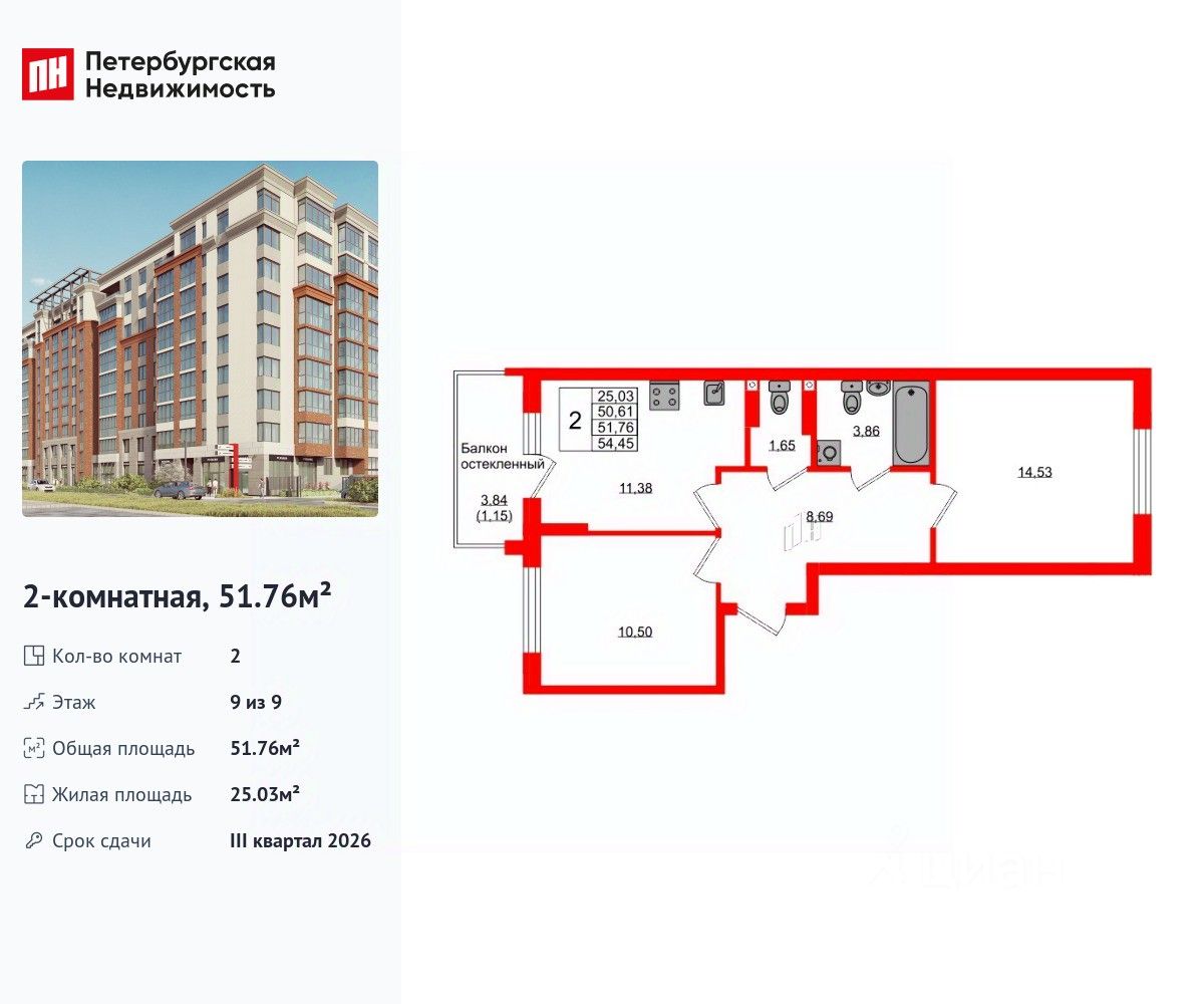 Удобная, классическая планировка, кухня 11.38 м², просторная прихожая 8.69 м². Общая площадь квартиры - 51.76 м², жилая 25.03 м², высота потолка 3 м.