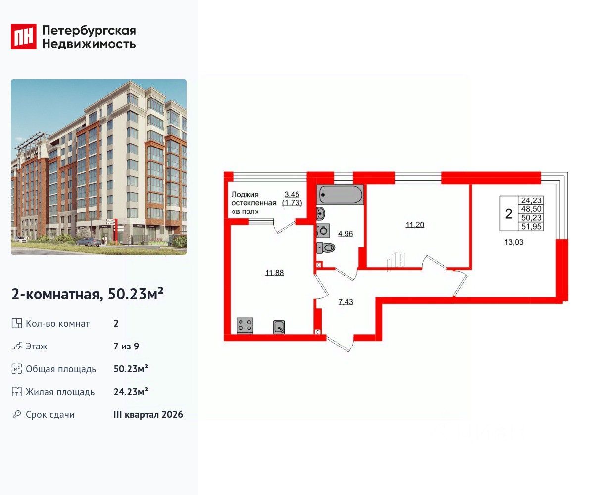 Удобная, классическая планировка, кухня 11.88 м², вместительная прихожая 7.43 м². Общая площадь квартиры - 50.23 м², жилая 24.23 м², высота потолка 2.7 м.