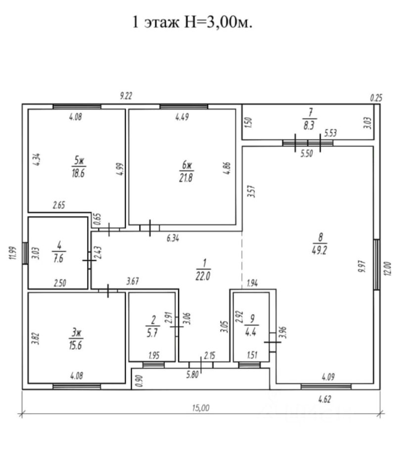 Планировка: Коридор-прихожая 22,0 м.кв., три комнаты 21,8/18,6/15,6 м.кв., два санузела 7,6/5,7 м.кв., гардеробная 4,4 м.кв. кухня-гостинная 49,2 м.кв. Есть отдельный второй вход из кухни-гостиной. В двух комнатах панорамные окна с выходом во двор.