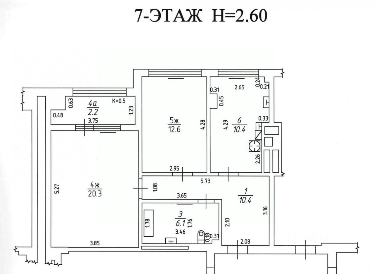 Общая площадь квартиры составляет 64 кв.м. с учетом лоджии (4,4 кв.м.). Кухня-столовая 10,4 кв.м., жилые комнаты 20,3 и 12,6 кв.м., санузел совмещенный 6,1 кв.м. прихожая 10,4 кв.м., застекленная лоджия 4,4 кв.м.