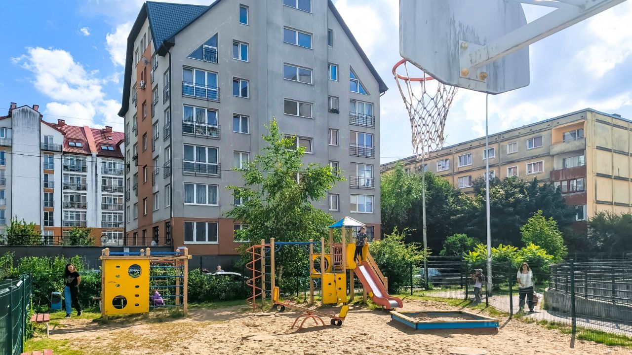 Закрытая территория дома с детским игровым комплексом. Подземная парковка. Установлены видеокамеры наружного наблюдения.
