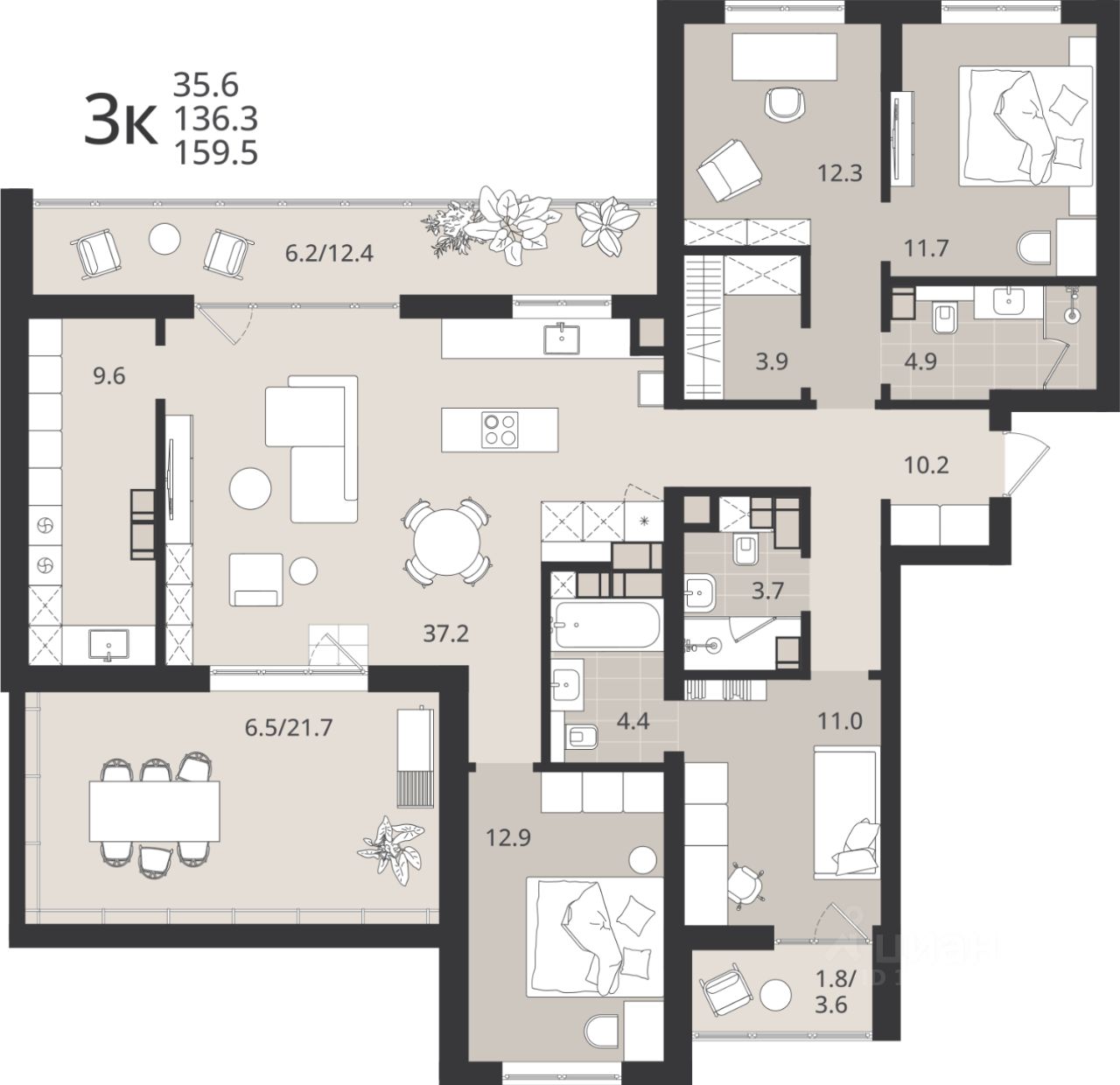 Общая площадь136,3 м2