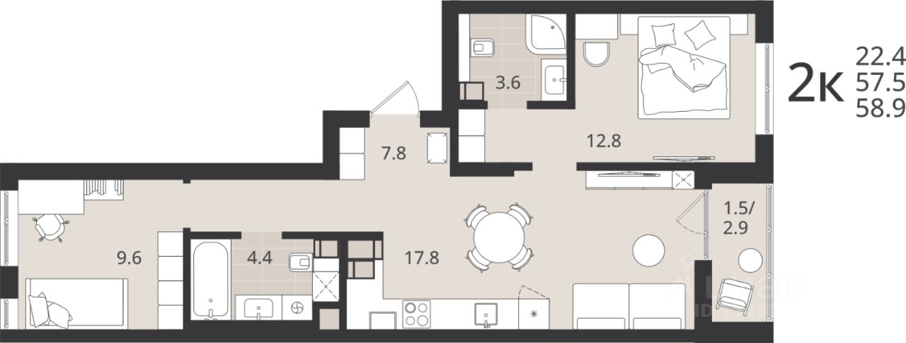 Общая площадь57,5 м2