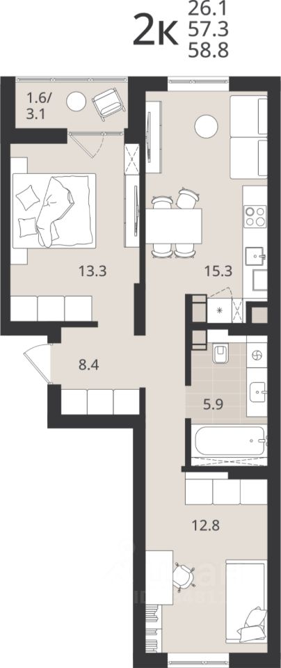 Общая площадь57,3 м2