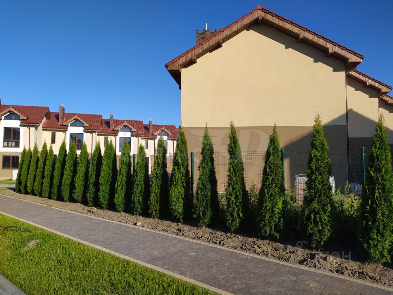 Территория таунхауса огорожена и озеленена.