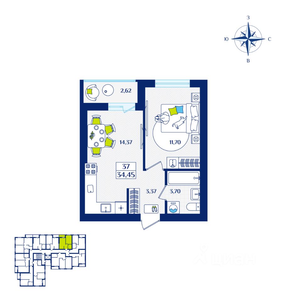 Общая площадь34,45 м2
