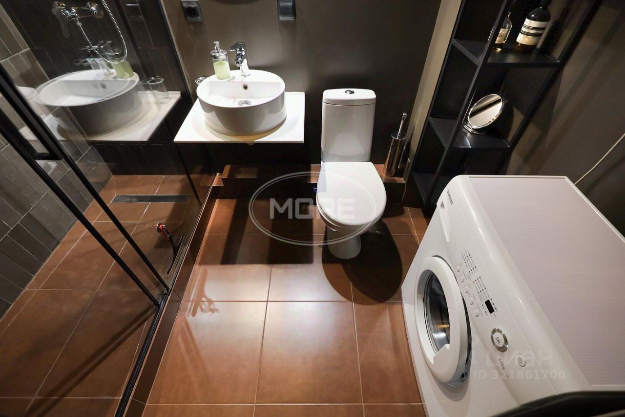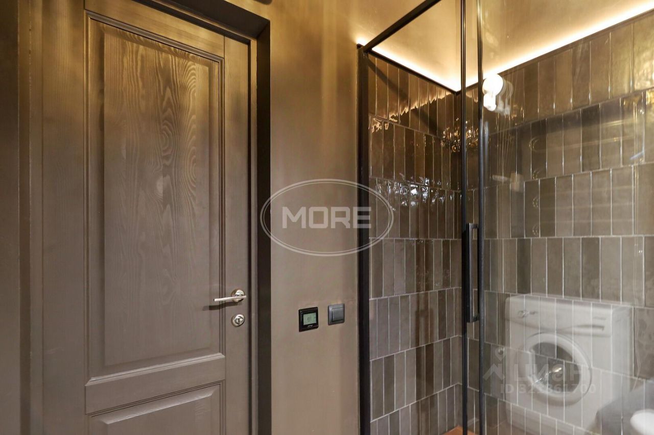 Общая площадь квартиры составляет 40 кв. м, из которых 23,7 кв. м — жилая площадь, а 6 кв. м — кухня. Совмещённый санузел оборудован большой душевой и электрическим теплым полом, а зона спальни отгораживается стеклянной перегородкой со шторой, что добавляет функциональности планировке.