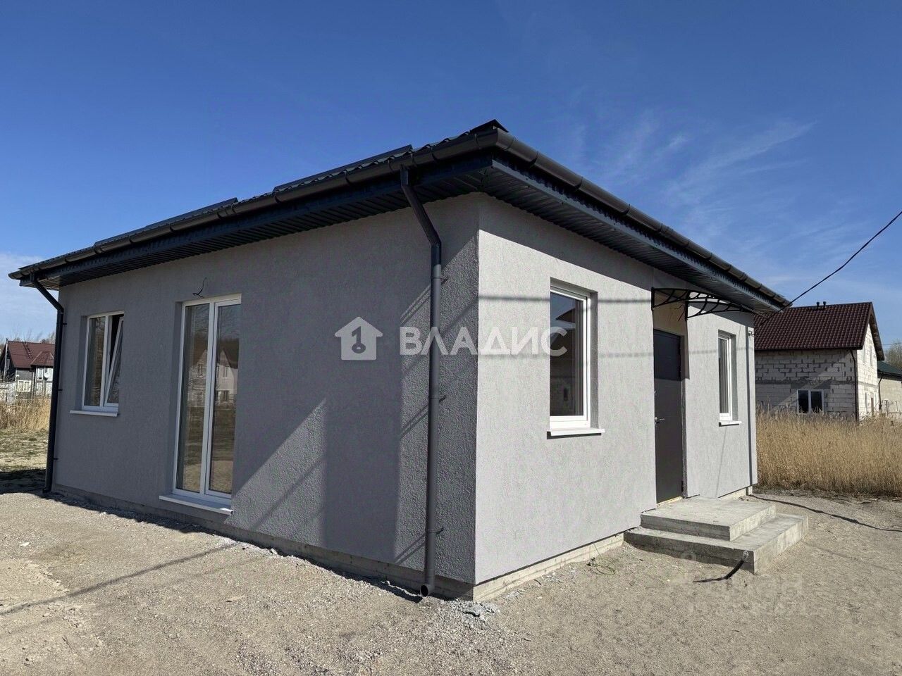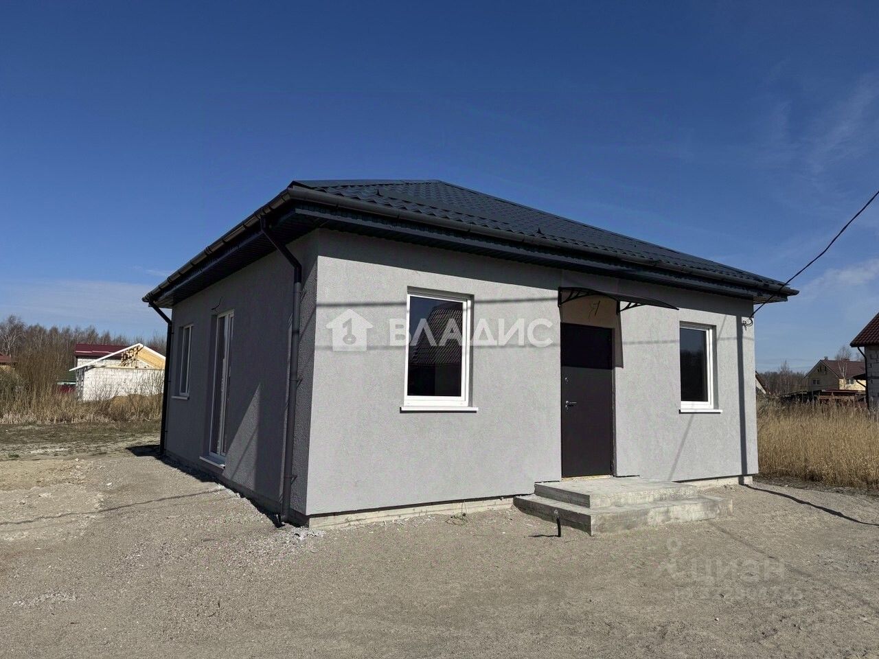 Характеристики дома: Площадь дома 65 м2 Планировка: кухня-гостиная 18,5 кв. м, 2 комнаты-12,2 и 12,2 кв.м , совмещённый санузел, холл. Высота потолка 3 м. Материал стен газосиликатный блок. Фундамент железобетонный, монолитный (лента + плита.) Перекрытия деревянные балки, пароизоляционная пленка, минеральная вата. Древесина обработана противогрибковыми средствами. Кровля металлическая черепица, смонтирована ливневая система. Год постройки 2025 г. Состояние серый ключ.