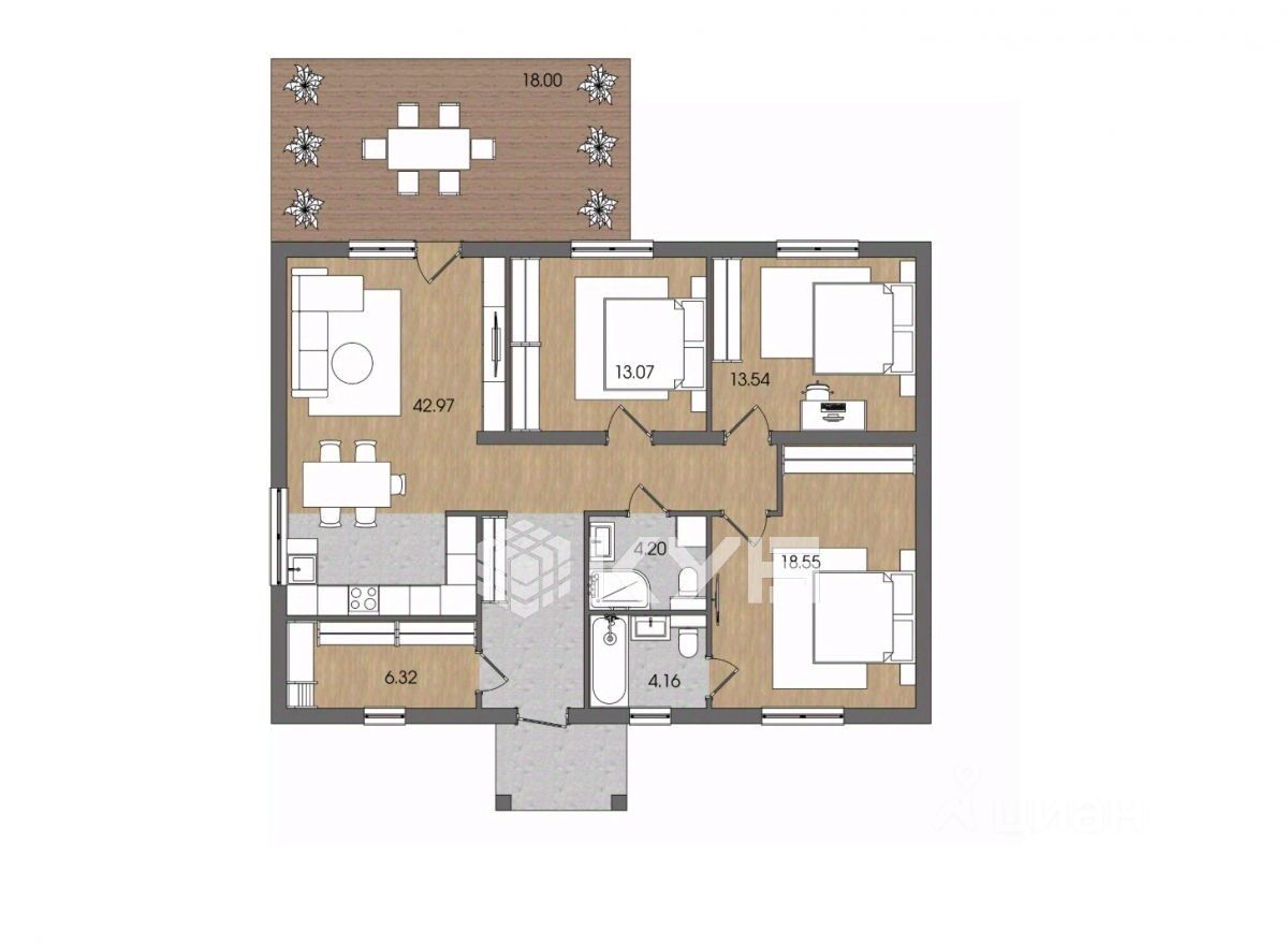 - Дом имеет просторную кухню-гостиную 43 м2, три спальни, два санузла (4.20 м2 и 4.16 м2 ), гардеробную, котельную с окном (двухконтурный котел, счетчики, выводы под стиральную машину), большую террасу 18 м2.