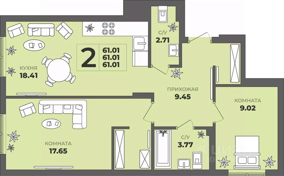 Продаётся 2-комнатная квартира в строящемся доме (Дом 2), срок сдачи: II-кв. 2027, общей площадью 61.01 кв.м., на 1 этаже. ЖК ''ГРИНВУД''.