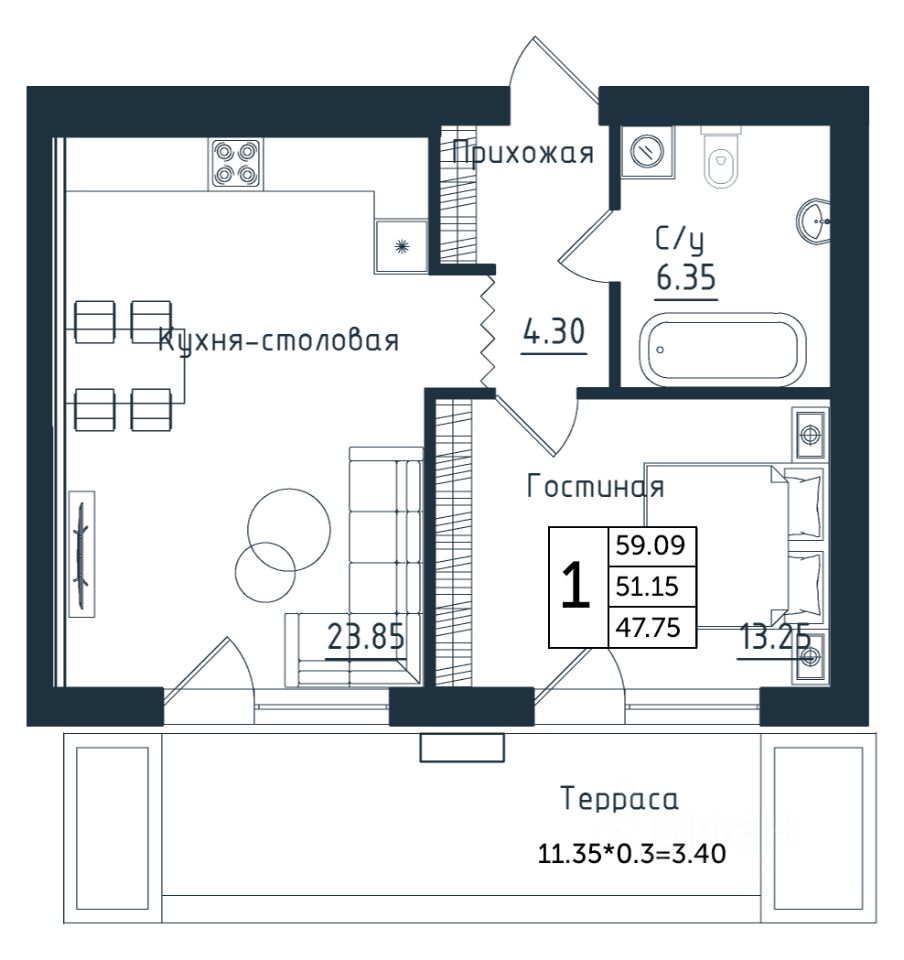 Продаётся 1-комнатная квартира в строящемся доме (Дом 3), срок сдачи: II-кв. 2026, общей площадью 59.09 кв.м., на 1 этаже. Новый жилой комплекс ''Янтарные Сезоны'' от Группы компаний ''Модуль-Стройград'' расположен по адресу: Калининградская обл., пгт Янтарный, ул. Советская.