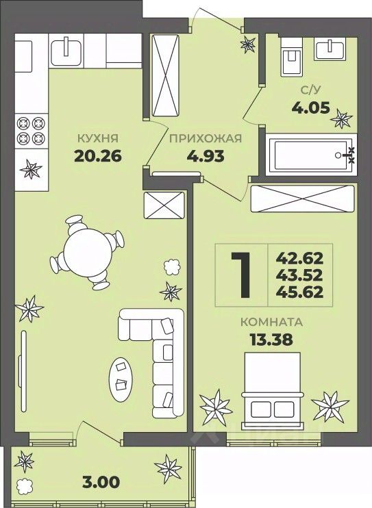 Продаётся 1-комнатная квартира в строящемся доме (Дом 1), срок сдачи: II-кв. 2027, общей площадью 43.52 кв.м., на 2 этаже. ЖК ''ГРИНВУД''.