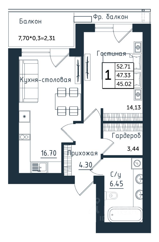 Продаётся 1-комнатная квартира в строящемся доме (Дом 3), срок сдачи: II-кв. 2026, общей площадью 52.71 кв.м., на 5 этаже. Новый жилой комплекс ''Янтарные Сезоны'' от Группы компаний ''Модуль-Стройград'' расположен по адресу: Калининградская обл., пгт Янтарный, ул. Советская.