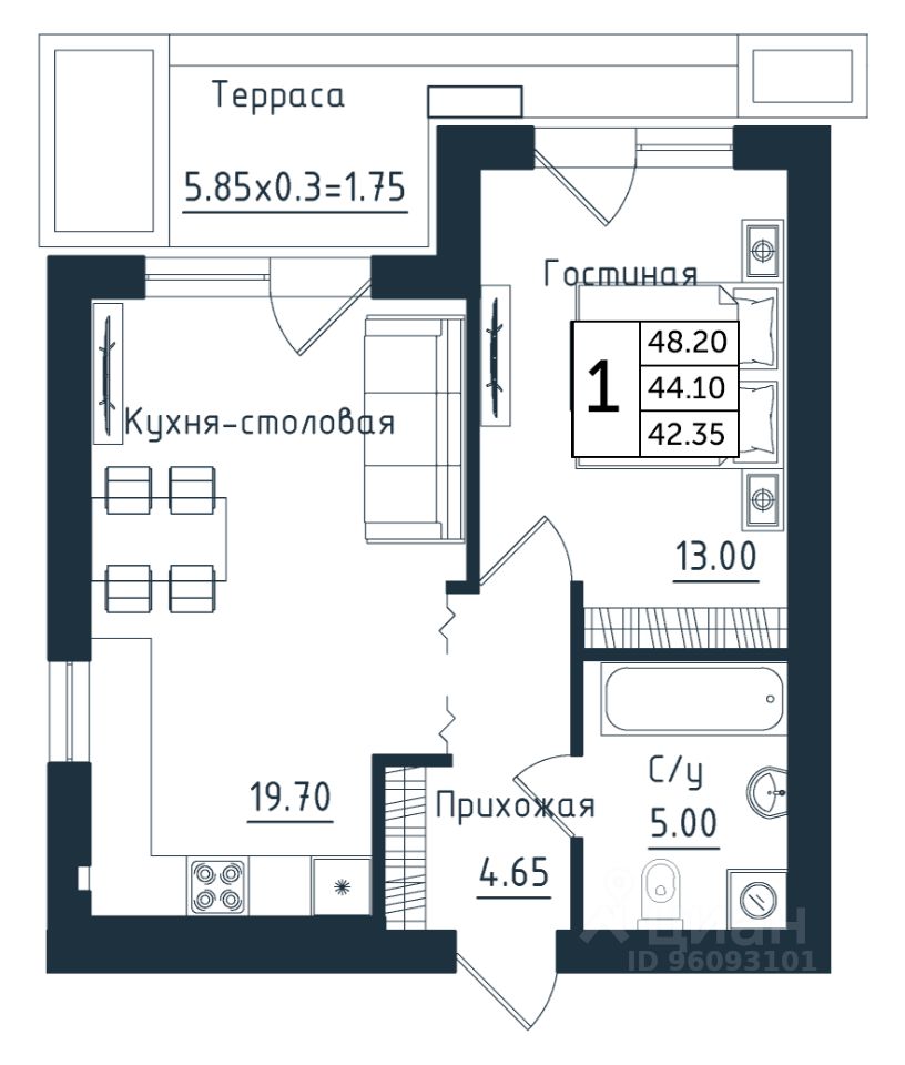 Продаётся 1-комнатная квартира в строящемся доме (Дом 3), срок сдачи: II-кв. 2026, общей площадью 48.2 кв.м., на 1 этаже. Новый жилой комплекс ''Янтарные Сезоны'' от Группы компаний ''Модуль-Стройград'' расположен по адресу: Калининградская обл., пгт Янтарный, ул. Советская.
