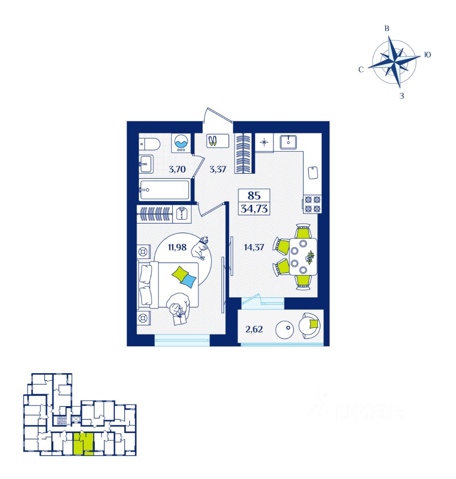 Общая площадь34,73 м2