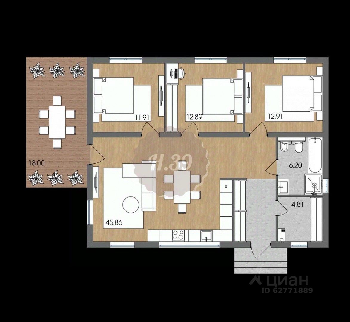 Автономное газовое отопление от газового котла, установленного в технической комнате. Дизайнерский ремонт. Мебель и техника. 3 отдельные комнаты. Совмещённый санузел. Просторная терраса с выходом из кухни-гостиной.