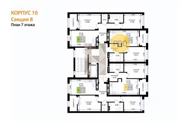 Квартира: 2 к 62,98 кв.м., 7 этаж в комплексе Включи, 5 очередь, корп.10, сдача: 3кв. , этажей: 7, адрес Гурьевск г., Героя России Катериничева ул., , Застройщик: ССК. Номер в базе: J31260L27007